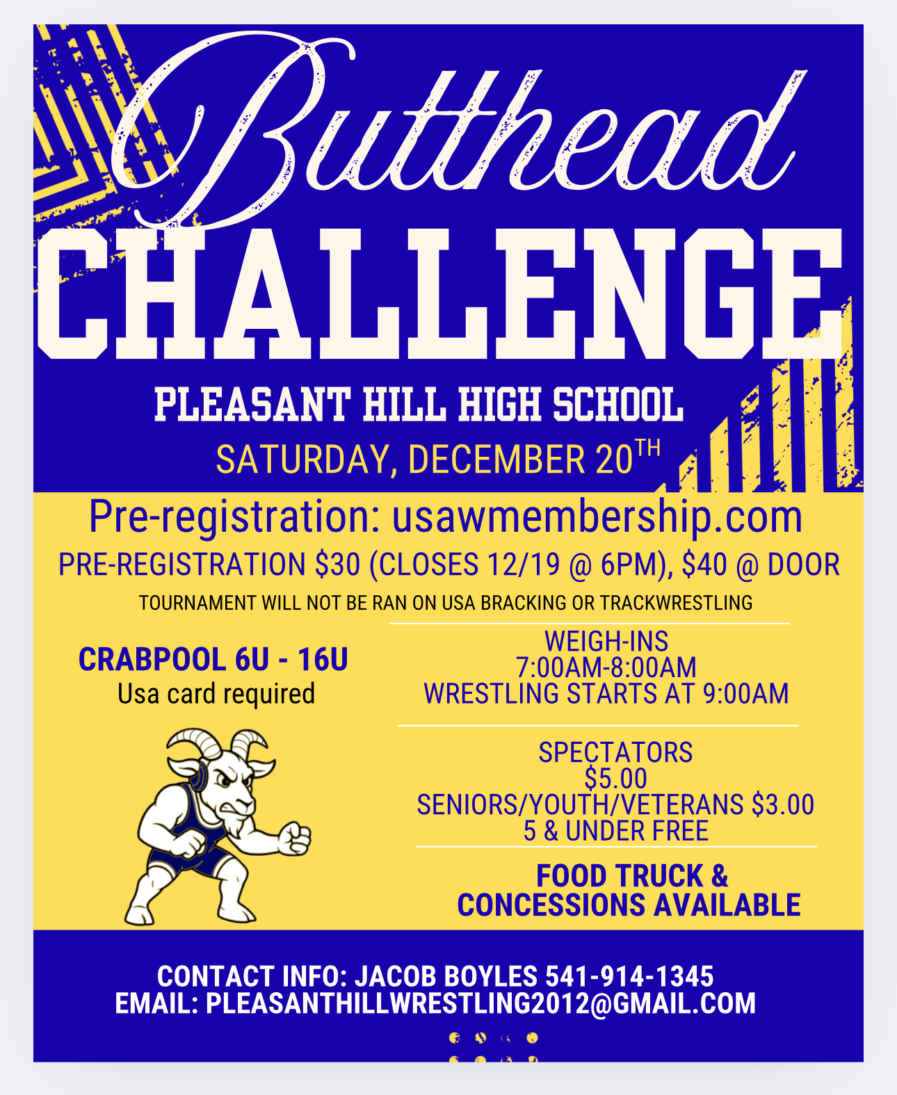 12/20 – Butt Head Tournament @ Pleasant Hill High School click here for flyer
